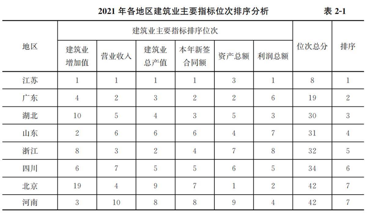 《中国建筑业发展年度报告(2021)》正式公布全国各省市建筑业主要指标位次排序。排序选取建筑业增加值、营业收入、建筑业总产值、本年新签合同额、资产总额、利润总额6项指标。总体上看,全国建筑业总产值持续快速增长,体现出了建筑业发展的“中国速度”。但从具体指标看,各地区还是略有差别,有的地区高歌猛进,有的地区增速减缓。