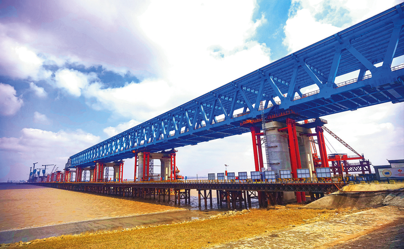 中铁大桥院参与设计,中铁大桥局施工的崇启公铁长江大桥是一座世界级桥梁工程,跨越长江入海口北支航道,非通航孔桥为主跨112米连续钢桁结合梁,合计长1205.4米,采用(99.2米+9×112米+98.2米)的11跨布局。 戴翀 周威 崔永兴 摄影报