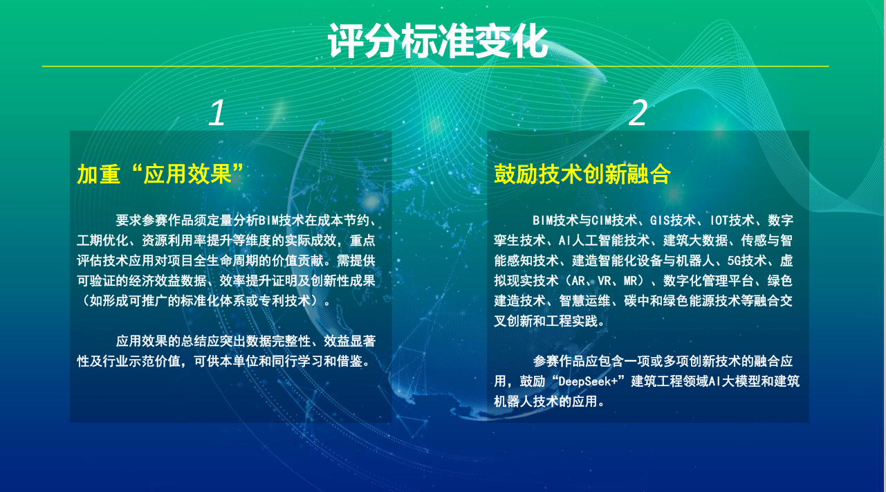 围绕《2025年武汉建设工程BIM大赛交底及答疑》主题,讲师重点解读本届大赛"数驱价值、智建未来"主题,明确报名流程及作品提交要求。本届大赛增设"专项创新成果"奖项,优秀作品将推荐至中国建筑业协会第十届BIM大赛。评分标准强化"应用效果"权重,要求成果体现数据完整性、效益显著性和行业示范价值。技术融合成为新亮点,大赛鼓励BIM与AI、数字孪生、物联网、5G等前沿技术结合,特别是"DeepSeek+"AI大模型与建筑机器人的创新应用。
