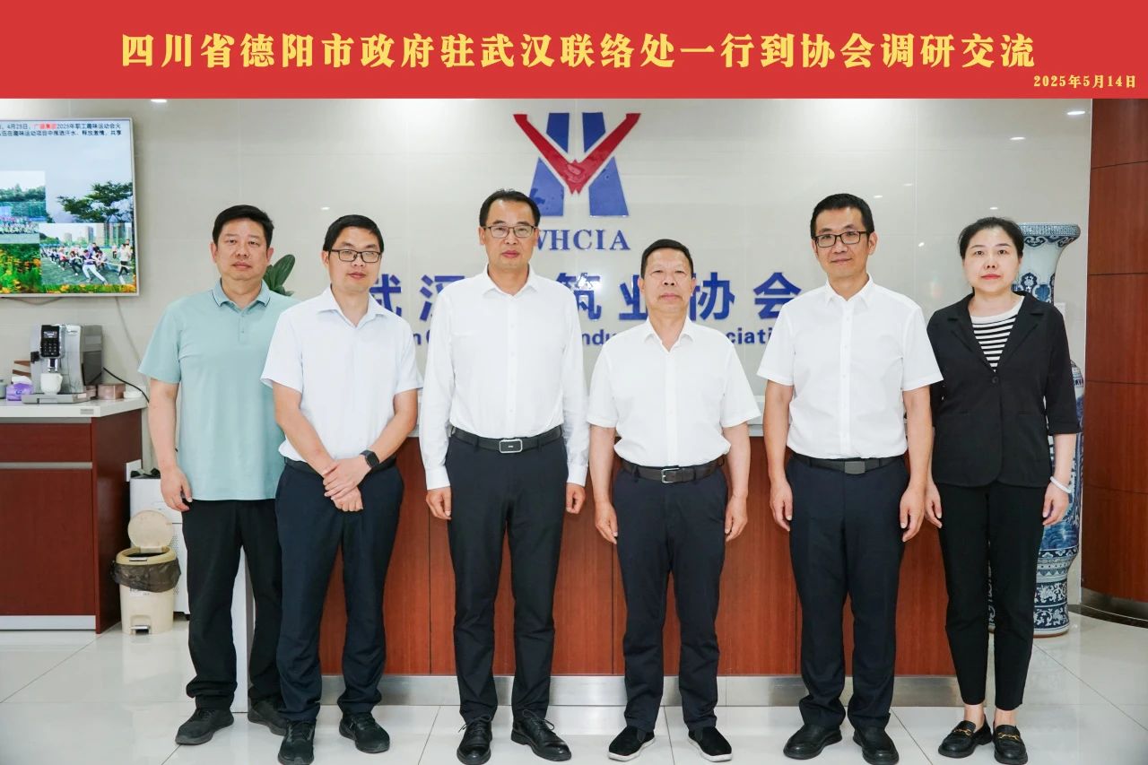 5月14日,四川省德阳市人民政府驻武汉联络处主任李明,招商策划部部长刘江一行到协会座谈交流,双方围绕区域产业协同、建筑行业资源互通等议题深入探讨,共谋合作新路径。协会秘书长李红青,副秘书长何洪普,供应链与劳务管理分会秘书长余旸,行业发展部副部长王琼参会。
