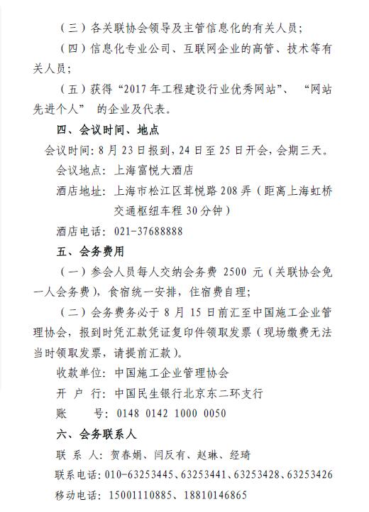 为贯彻落实《国家信息化发展战略纲要》,深入实施“互联网+”行动计划,更好地帮助工程建设企业探索“互联网+”创新发展模式,推动互联网与信息技术和工程建设行业发展深度融合,进而促进企业转型升级、提质增效。中国施工企业管理协会定于 8 月 23 日至 25 日在上海召开“第三届工程建设行业互联网大会”。现将会议通知全文转发,请关联单位积极组织有关人员参加。