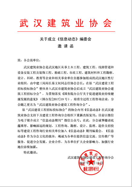 原“武汉建设工程招标投标协会”并入武汉建筑业协会后,重新整合更名为“武汉建筑业协会建设工程咨询分会”。其协会内刊《信息动态》在武汉建筑业协会支持下及建设工程咨询分会组织下重新改版复刊。考虑到电子媒体的时效性与广泛性,经协会领导一致决定,以微信为电子媒介正式成立“信息动态期刊”微信公众号。致力于建设工程全过程咨询企业的信息服务。消息推送以政策解读、行业动态、会员讯息为主,为规划、工程咨询、勘察、设计、招投标、造价、监理等咨询企业提供最新的行业资讯。