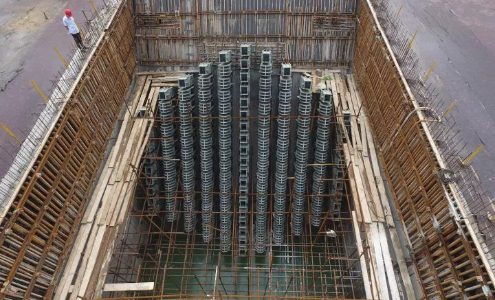 据中铁大桥局杨泗港长江大桥二分部总工韩胜利介绍,杨泗港南锚碇外径为98米为世界同类型桥梁最大,平面面积相当于16个篮球场的大小,成槽深度66.8米,施工中经过了地下连续墙、基坑开挖、浇筑混凝土、锚固系统安装等多项工序,最终历时14个月完工。在锚固系统安装过程中,采用了精制螺栓进行连接,与以往采用高强螺栓连接相比,能使其在结构上受力能力更强,还能更好地将索股拉力传递至锚碇混凝土,满足杨泗港长江大桥一跨过江设计索股受力需要。