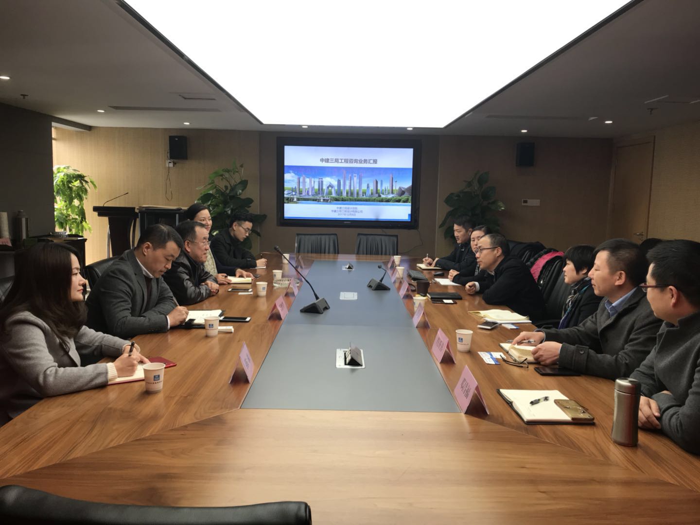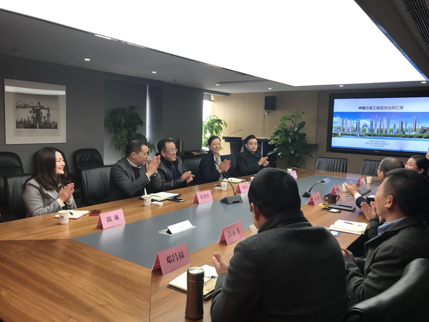 2017年12月5日上午,武汉建筑业协会副会长兼秘书长李淼磊、建设工程咨询分会会长张智学、行业发展部部长邓小琴等一行到中建三局走访调研。中建三局工程设计有限公司董事长黄刚、总经理黄安平、彭斌、刘会琳、肖开喜、邓昌福、陈宇飞等参加了座谈。