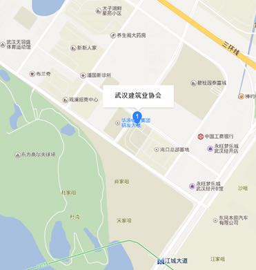 (图上蓝标为武汉建筑业协会,位于武汉市汉阳区春晓路与海棠路交叉口南100米武汉设计广场1栋11楼。)