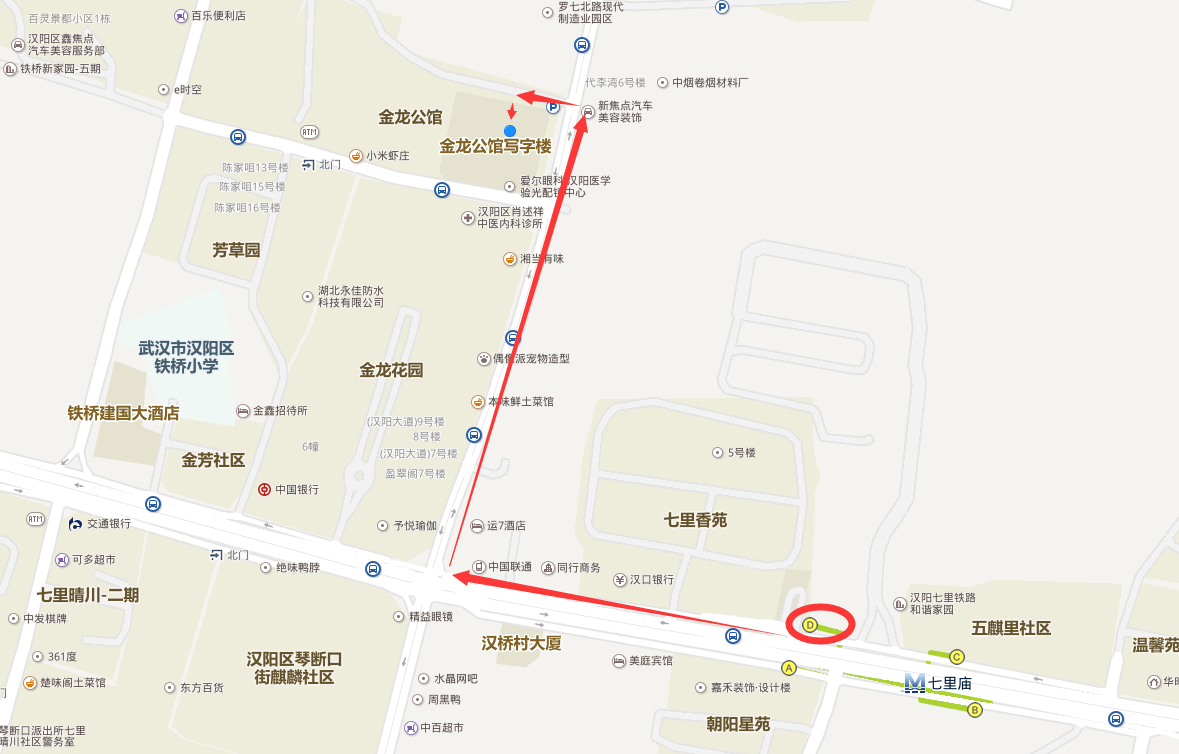 地铁:乘坐地铁4号线在七里庙站D出口出,步行约10分钟到达,如图: