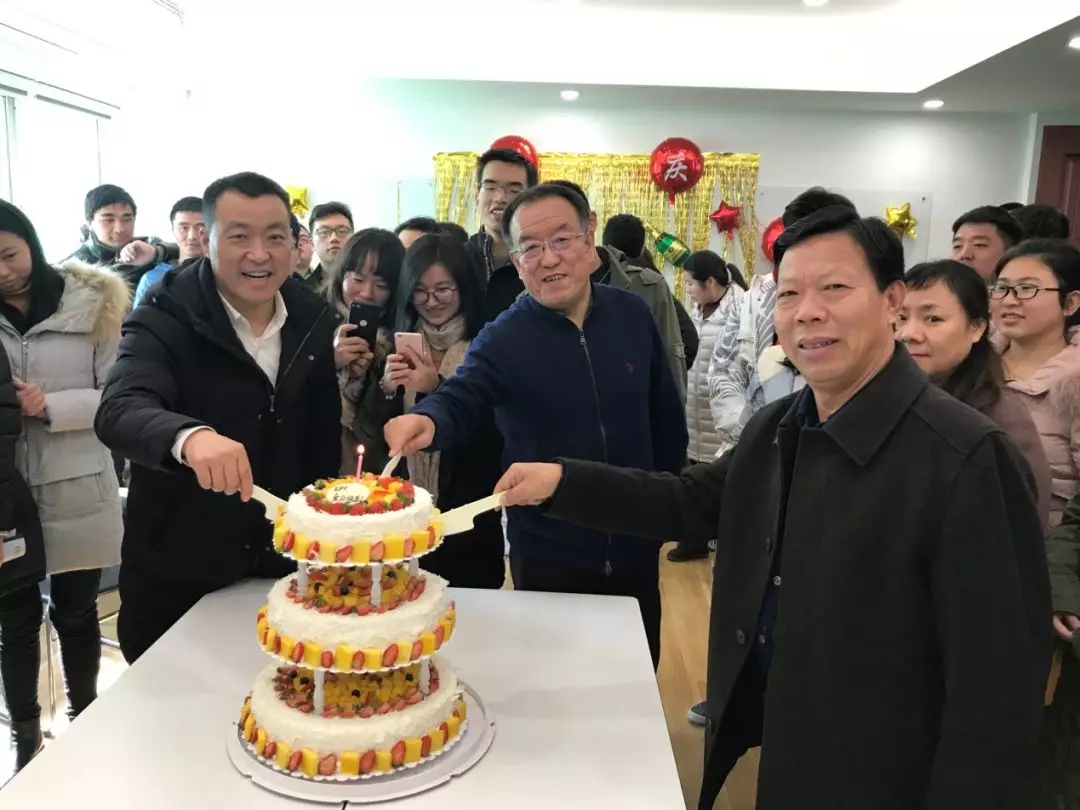 活动最后,张智学(左一)、李淼磊(左二)与李红青(左三)共同切取公司一周年祝福蛋糕。