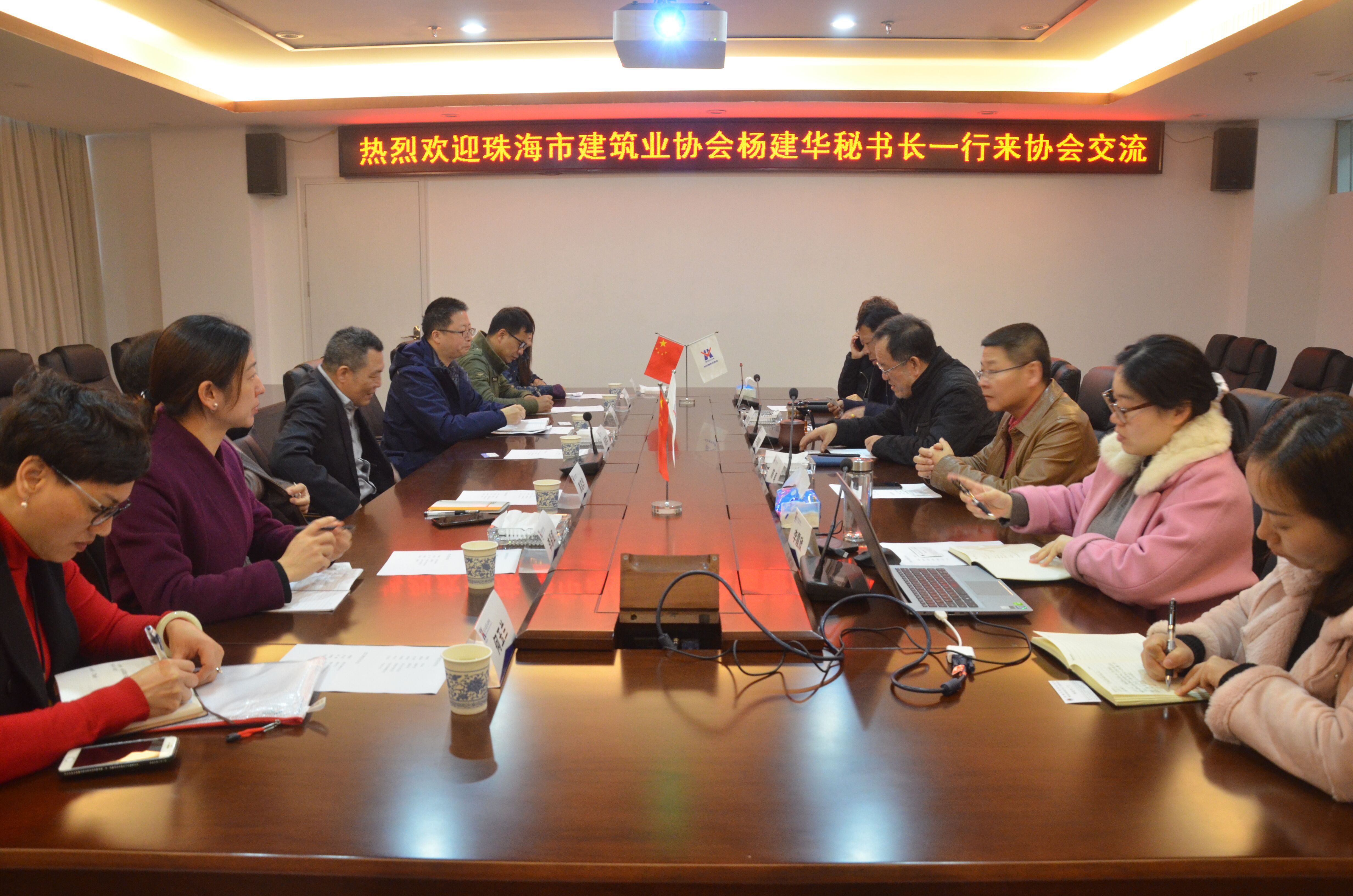 杨建华一行介绍珠海市建筑业协会自身情况的同时,向协会提出了如何承接政府购买服务、评优评奖事宜、促进民营企业转型升级的相关措施、四大学堂培训、会刊编辑、通联员管理办法和“四比四赢得”绩效考核管理办法等问题。