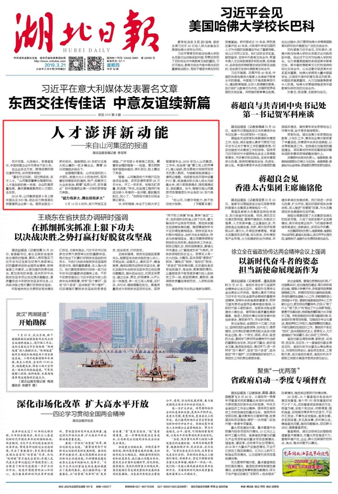3月21日,湖北日报头版刊发稿件《人才澎湃新动能》,这篇来自山河集团的报道,生动地展现了集团实施人才发展战略,通过高素质的人才团队实现企业高质量发展的路径。
