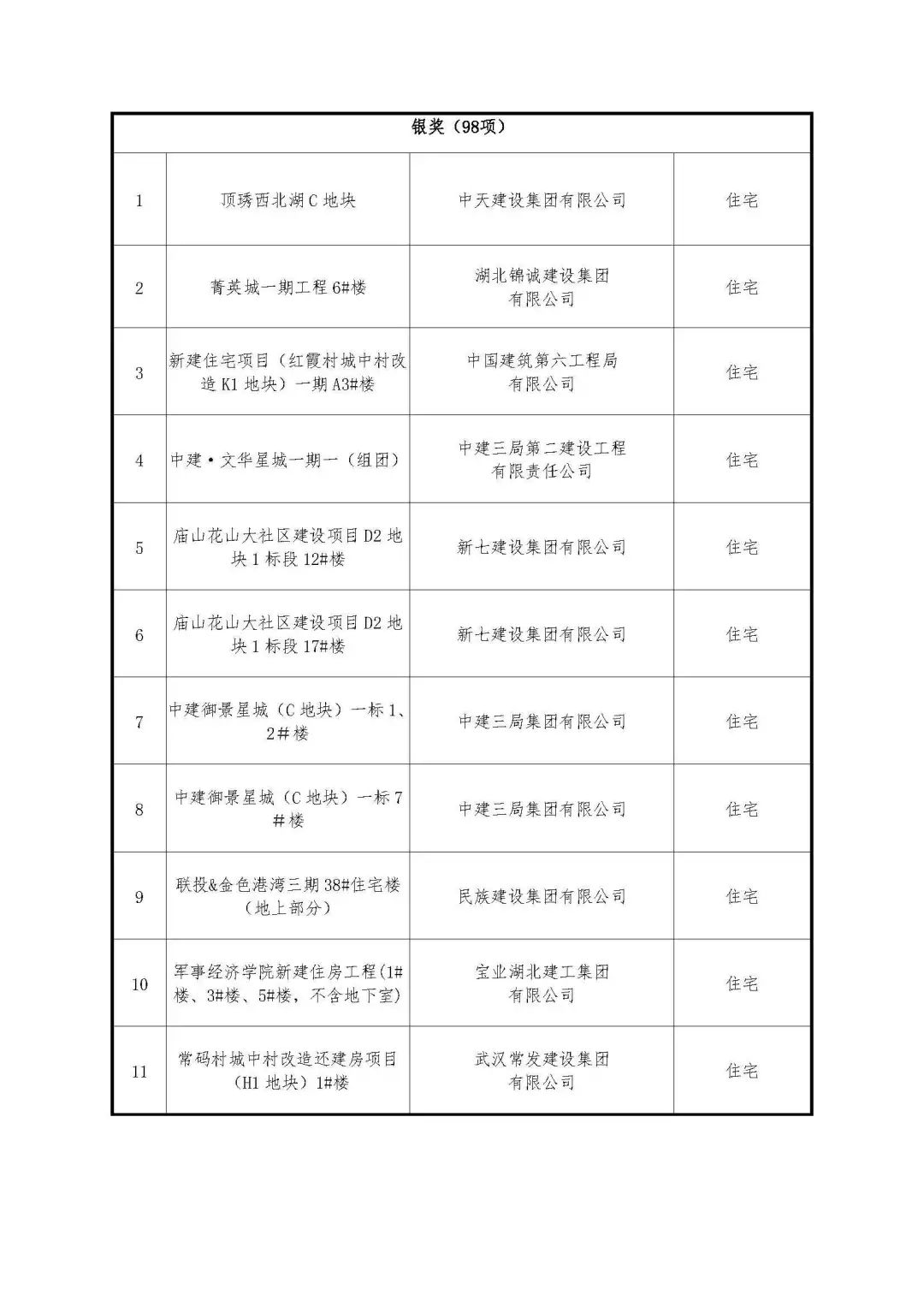 根据《武汉市建设工程黄鹤奖评审办法》(武建协〔2017〕52号)和《关于开展武汉市第二十届建设工程黄鹤奖评选工作的通知》(武建协〔2019〕15号)精神,经企业自愿申报、质量工作委员会资料审核、专家现场核查、评审委员会审定、报主管部门审核、公示,并经会长办公会审议通过,武汉市2018年度(第二十届)建设工程黄鹤奖评选结果已经揭晓,中建三局集团有限公司承建的武汉光电国家研究中心等9项工程获2018年度武汉市建设工程黄鹤奖金奖;中天建设集团有限公司承建的顶琇西北湖C地块等98项工程获2018年度武汉市建设工程黄鹤奖银奖。现将获奖名单予以发布(具体获奖名单见附件)。