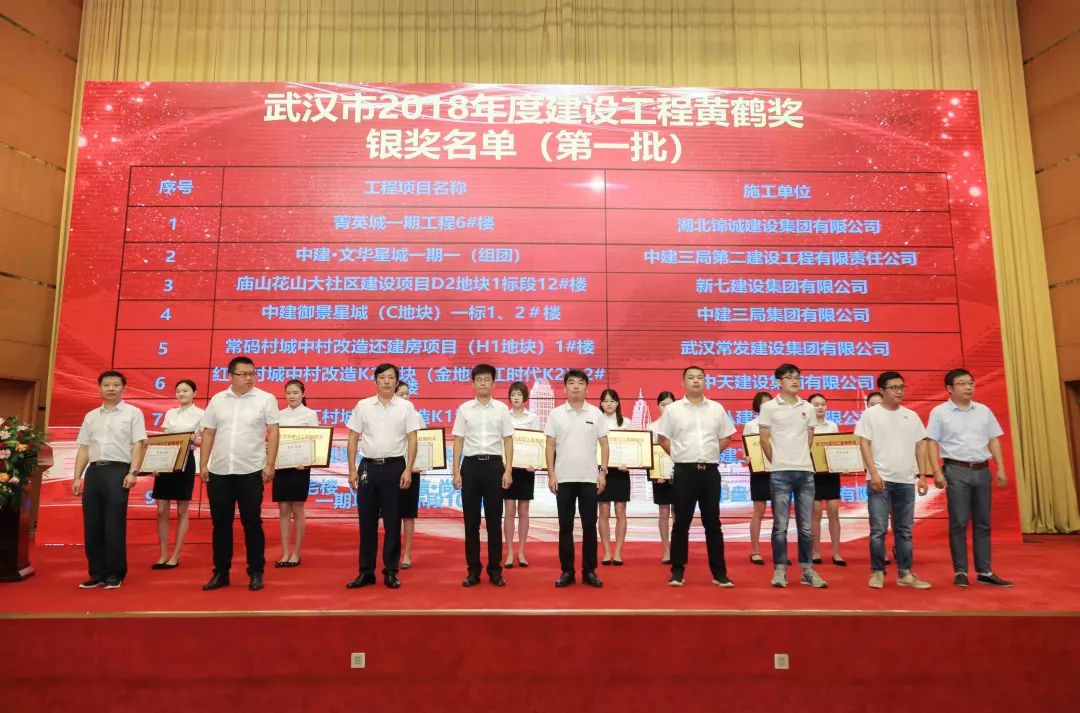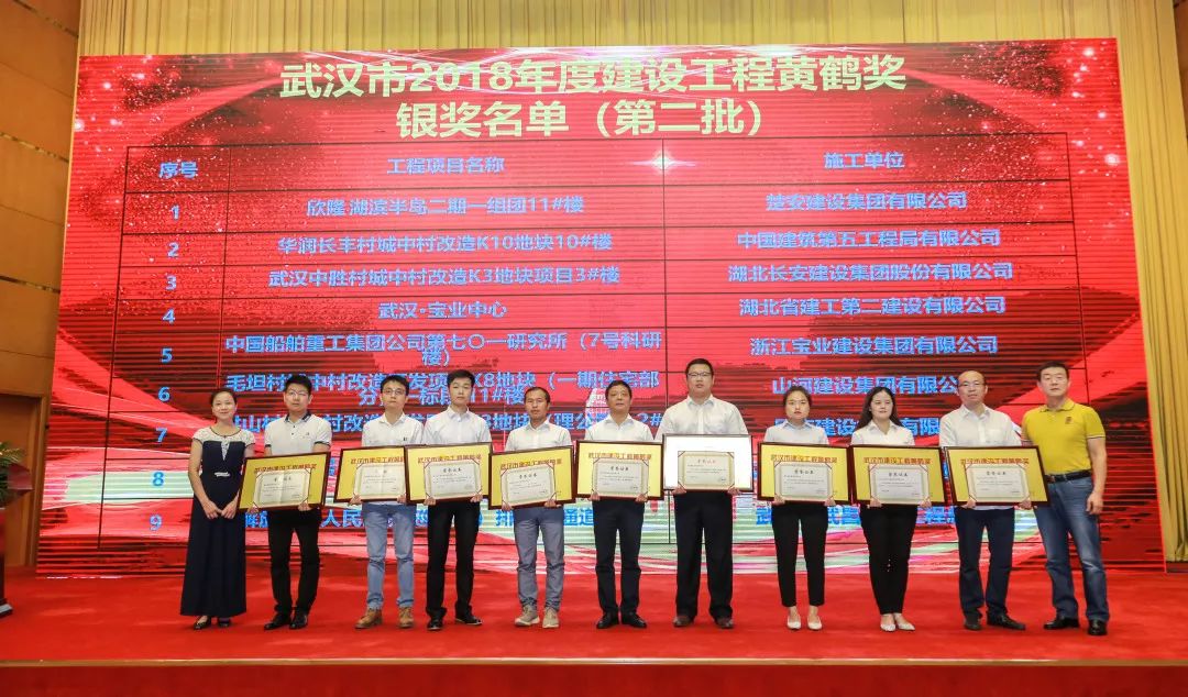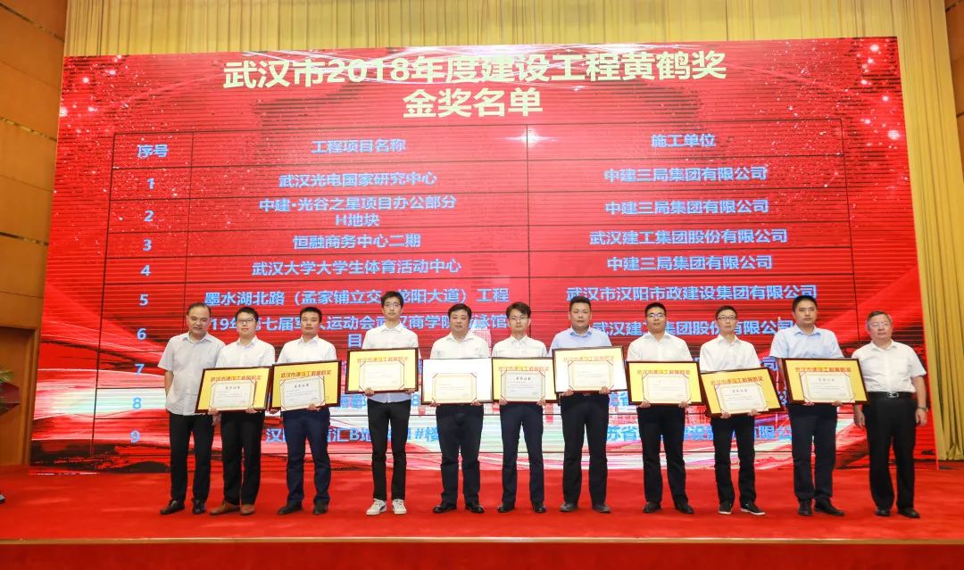 会议举行了2018年度武汉建设工程黄鹤奖颁奖仪式,与会领导为获得金奖的9个项目和18个银奖代表颁发了奖牌、奖杯和证书。