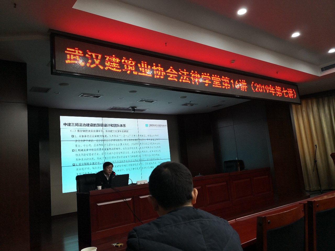 11月22日下午,协会法律学堂第16讲(2019年第七讲)在武昌中铁大厦开讲。本次讲座邀请中建三局集团合约法务部副总经理郑军主讲,由法工委副主任兼秘书长何啸伟主持。协会法工委副主任魏玲等出席,部分会员单位领导以及相关业务部门经理和工作人员,有关法律服务机构律师等50多人参加。
