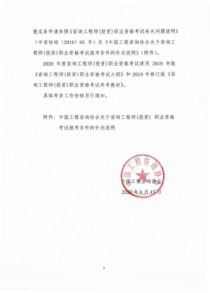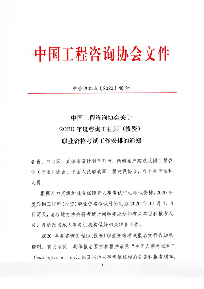 关于转发中咨协关于2020年度咨询工程师(投资)职业资格考试工作安排的通知