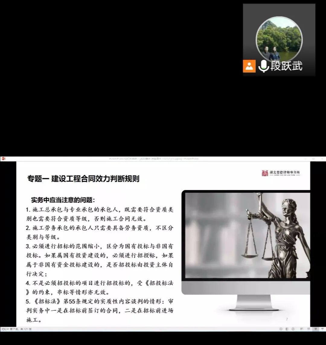 11月21日下午,协会2020年法律学堂第七讲网上举办,邀请湖北楚德律师事务所副主任暨业务拓展中心总监段跃武律师主讲《常见施工合同纠纷裁判规则》专题。中建三局、中交二航局、中铁十一局、中铁大桥局、中国一冶、武汉建工等部分会员及相关法律服务机构80多人参加。 段跃武律师主要讲述了与施工合同纠纷相关的7大裁判规则,分别为:施工合同效力判断规则,如关于合同无效的法律规定、民法典对合同效力的规定、最高人民法院关于确定合同无效的司法政策精神;工程价款结算规则,如发包方、承包方自行结算规则、建设工程施工合同有效的工程款结算、建设工程合同无效的工程款结算;施工工期认定规则,如开工日期、竣工日期、工期顺延等认定;招投标与黑白合同效力认定规则,如强制招投标工程项目范围、招投标行为与建设工程合同的订立关系、中标无效的情形、黑白合同的形式及裁判规则;实际施工人向发包人追索工程款的裁判规则,如实际施工人的法律定义、实务中常见问题、实际施工人对外实施的法律行为的责任承担问题;工程价款优先权的认定规则,如工程价款优先权的定义、工程价款优先权行使条件、工程价款优先权行使范围、期限等内容。