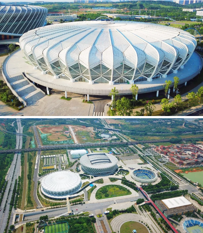 湖北省奥林匹克体育中心功能完善项目(综合性体育馆及动力站)位于武汉市东湖新技术开发区高新三路以北、佛祖岭一路以西。该工程由一座综合性体育馆及附属动力站等组成,主体结构为地上一层、局部地上四层、地下一层,总建筑面积37853平方米,建筑高度26.1米。是华中地区唯一一座主副馆可自由切换的综合性体育馆。