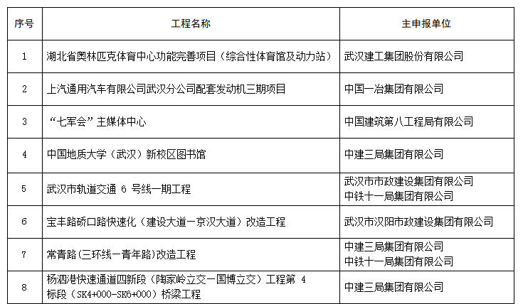 继11月30日,中国建筑业协会公示2020~2021年度首批“鲁班奖”名单,我市6项工程入选后,12月1日,中国施工企业管理协会发布《关于公布2020-2021年度第一批国家优质工程奖入选工程名单的通知》,我市8项工程入选。8项工程中房屋建筑工程4项,分别为湖北省奥林匹克体育中心功能完善项目(综合性体育馆及动力站)、上汽通用汽车有限公司武汉分公司配套发电机三期项目、“七军会”主媒体中心、中国地质大学(武汉)新校区图书馆;市政工程4项,分别为武汉市轨道交通6号线一期工程、宝丰路硚口路快速化(建设大道-京汉大道)改造工程、常青路(三环线-青年路)改造工程、杨泗港快速通道四新段(陶家岭立交~国博立交)工程第4标段(SK4+000~SK6+000)桥梁工程 。其中,武汉市轨道交通6号线一期工程荣获国家优质工程金奖,实现了我省房屋建筑与市政基础设施工程国优金奖零的突破。
