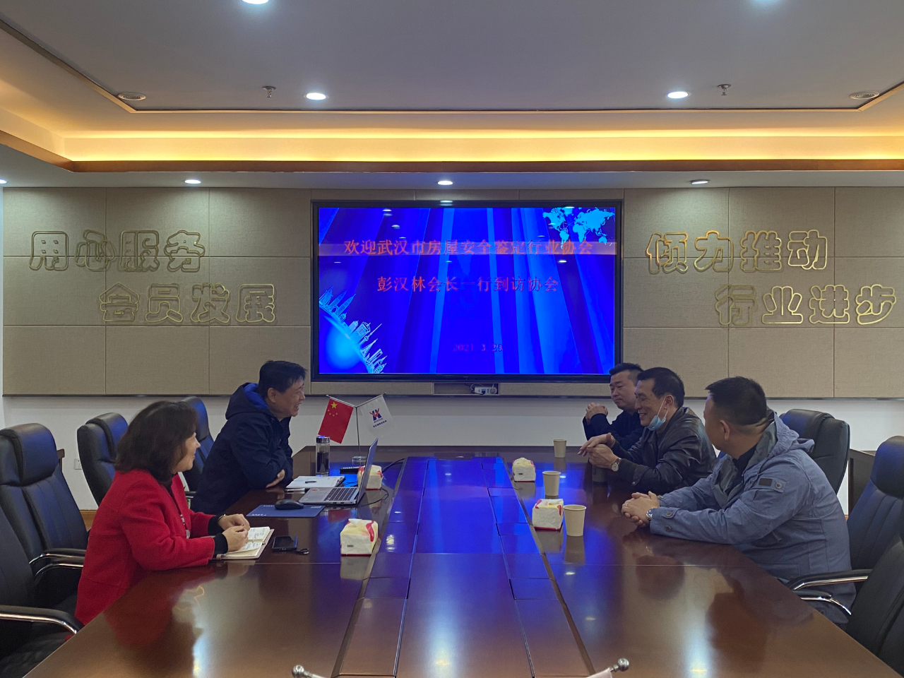 3月30日上午,武汉市房屋安全鉴定行业协会会长彭汉林、秘书长刘飞和常务理事刘洋一行到访协会,与协会建筑检测分会副会长兼秘书长李明强和副秘书长李胜琴座谈交流。