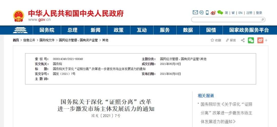 6月3日,国务院印发《关于深化“证照分离”改革进一步激发市场主体发展活力的通知》,部署自2021年7月1日起,在全国范围内实施涉企经营许可事项全覆盖清单管理,对所有涉企经营许可事项按照直接取消审批、审批改为备案、实行告知承诺、优化审批服务等四种方式分类推进审批制度改革,同时在自贸试验区进一步加大改革试点力度。