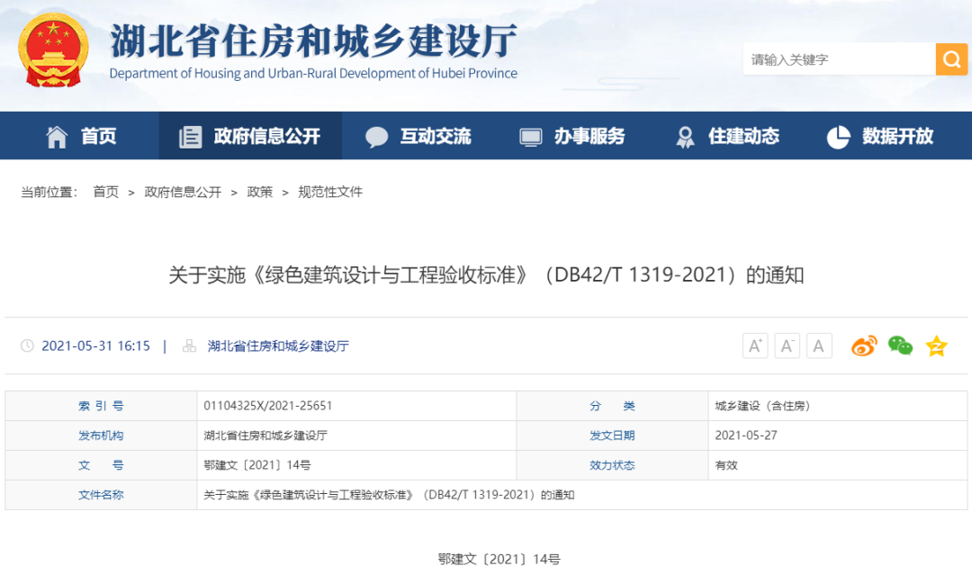 湖北省住建厅关于《实施绿色建筑设计与工程验收标准(DB42/T 1319-2021)》的通知