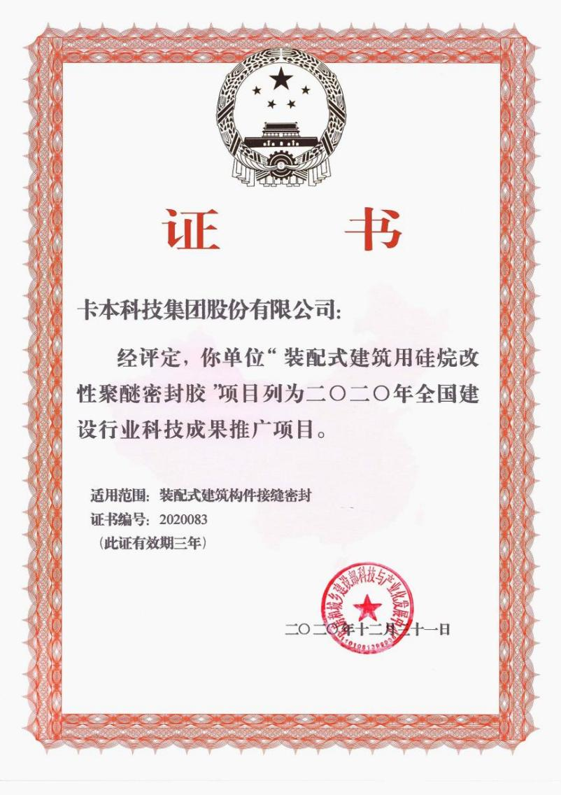 协会会员单位卡本科技集团股份有限公司的“装配式建筑用硅烷改性聚醚密封胶”(下文均称为“装配式建筑MS密封胶”)项目成功通过住房和城乡建设部科技成果评估,获得2020年“全国建设行业科技成果推广项目”证书。