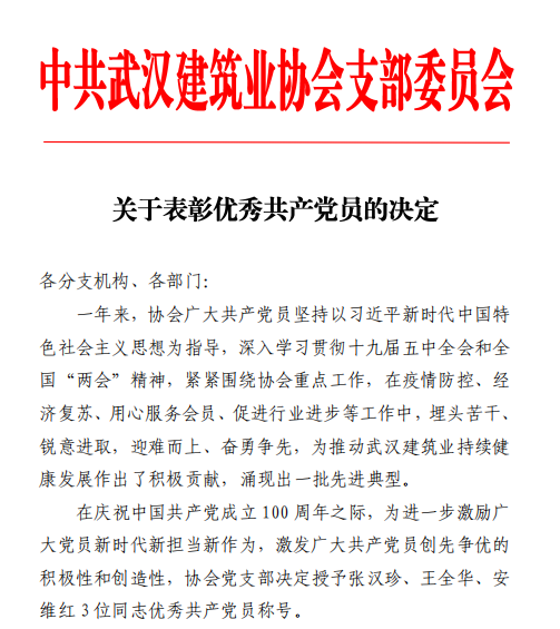 在庆祝中国共产党成立100周年之际,为进一步激励广大党员新时代新担当新作为,激发广大共产党员创先争优的积极性和创造性,协会党支部决定授予张汉珍、王全华、安维红3位同志先进称号。