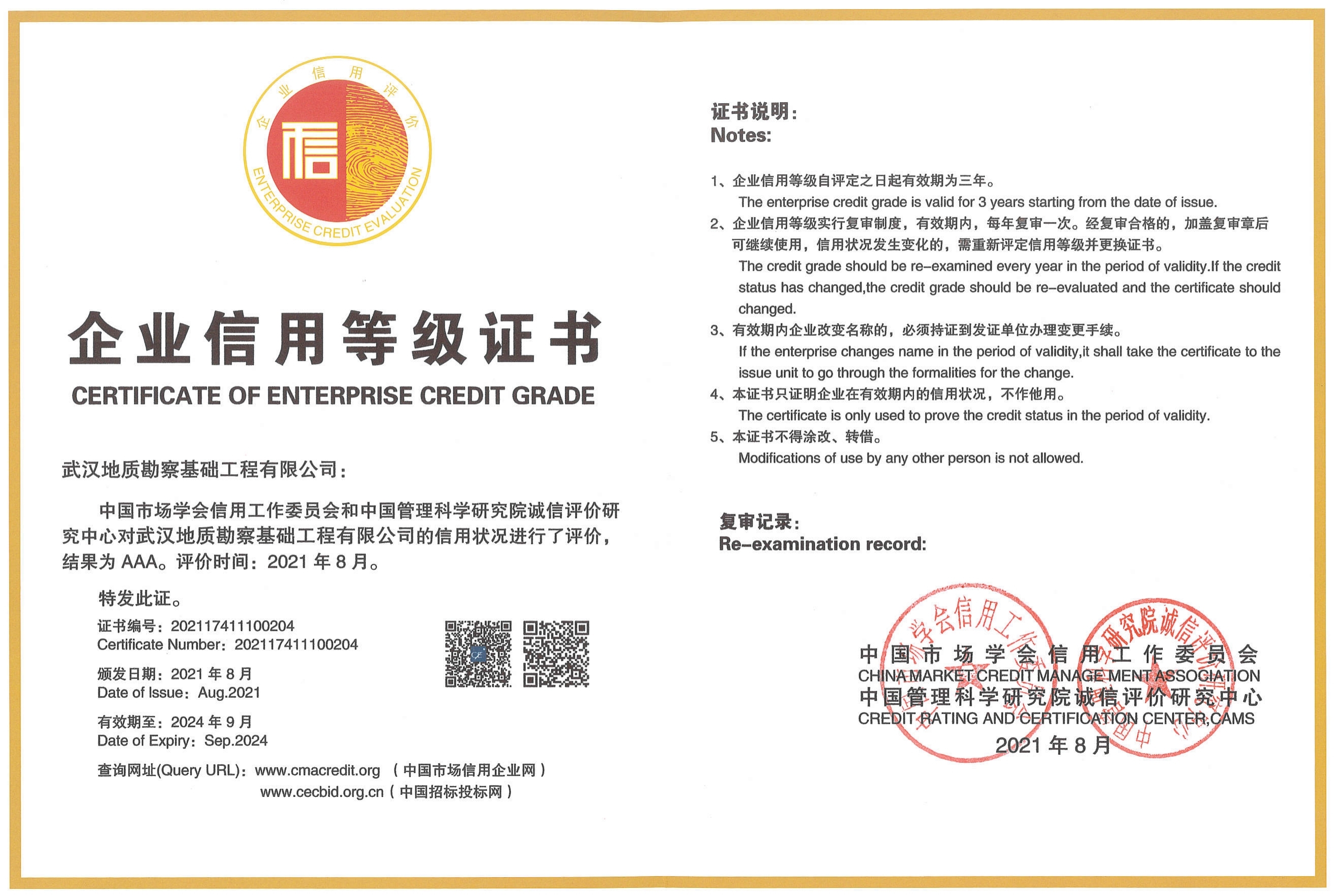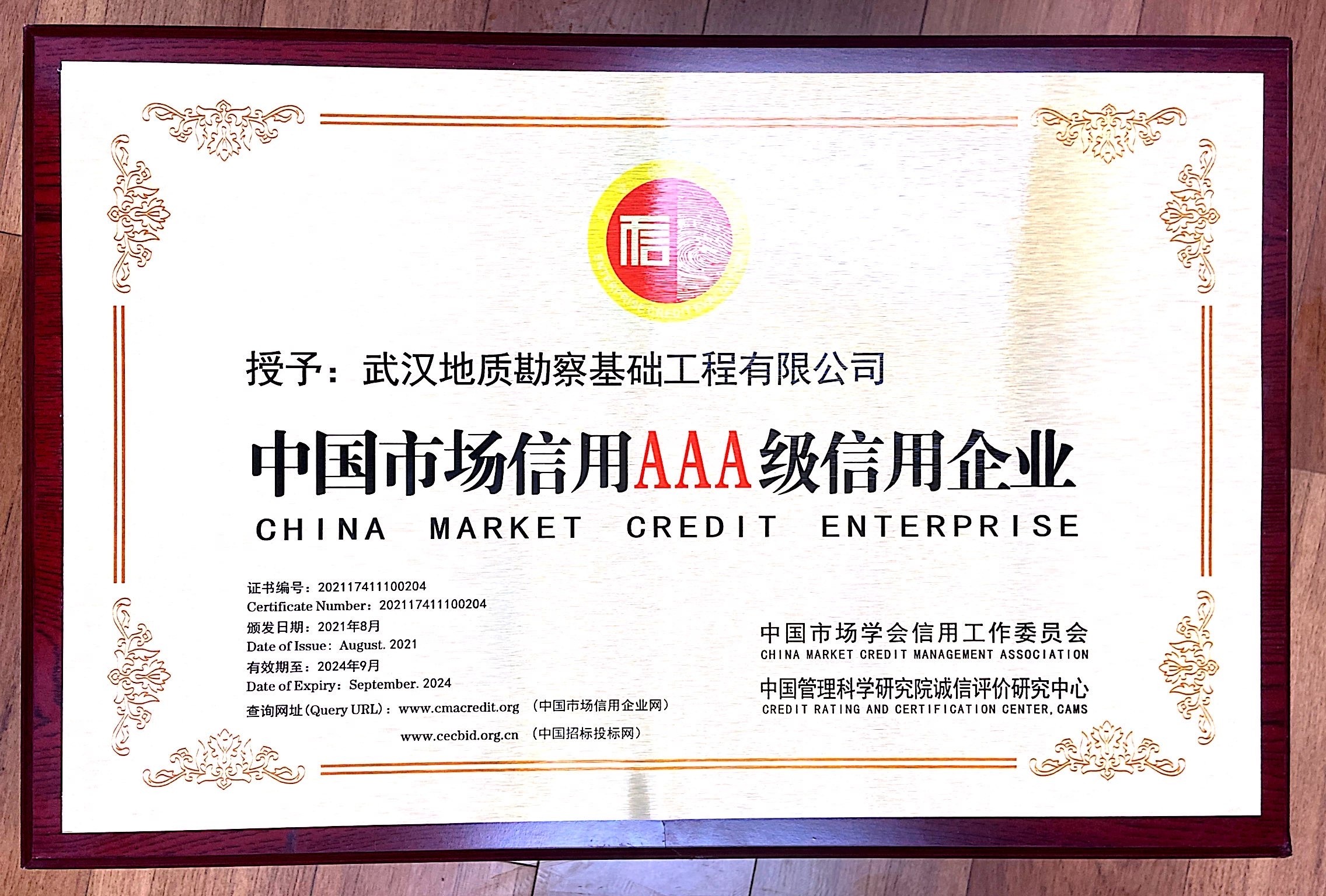 近日,武汉地质勘察基础工程有限公司被中国市场学会信用工作委员会、中国管理科学研究院诚信评价研究中心联合评为“中国市场信用AAA级信用企业”,这是武基公司连续10年获得AAA级信用评级。