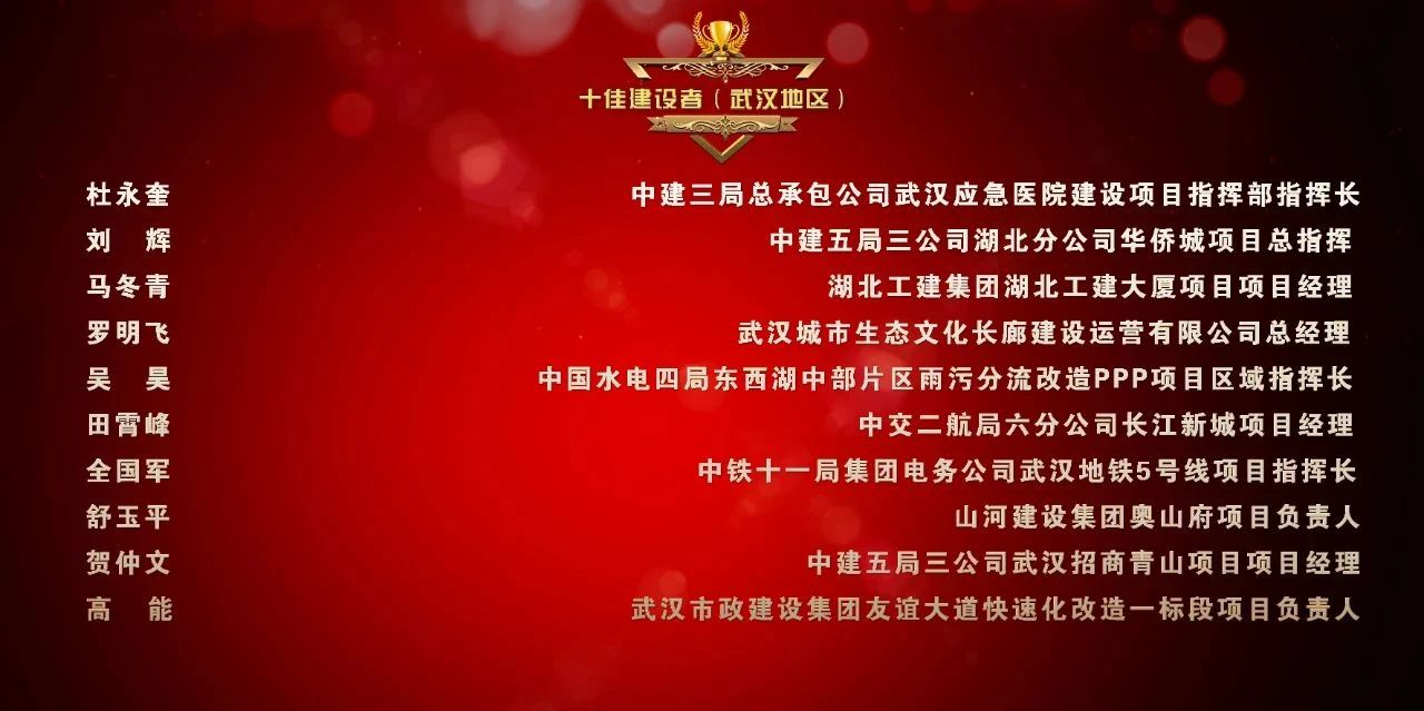 劳动竞赛“双十佳”选树活动,到今年已是第七届,产生了巨大的社会影响,被誉为武汉建筑业“奥斯卡奖”。今年活动经过网上投票、现场核查、评委综合考评、网上公示等程序,最终选树出“十佳建设者(武汉地区和外埠地区)各10名,“十佳创新项目(武汉地区和外埠地区)各10名,以及优胜者各10名。