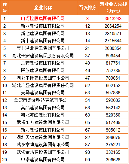 9月24日下午 湖北省工商联发布 2021湖北民营企业百强榜单 武汉建筑业协会 20家会员企业荣誉上榜 山河控股集团有限公司 位列百强榜前十位 协会20家上榜企业名单 湖北民营企业百强榜单以2020年企业营业收入排序,在产业分布上继续保持建筑业、批发业、综合产业“三足鼎立”的格局。 2020年,面对新冠肺炎疫情、严重洪涝灾害和严峻外部环境的多重冲击,湖北省民营企业在危机中育新机、于变局中开新局,撑起了湖北经济的“半壁江山”,是湖北发展的希望和潜力所在。