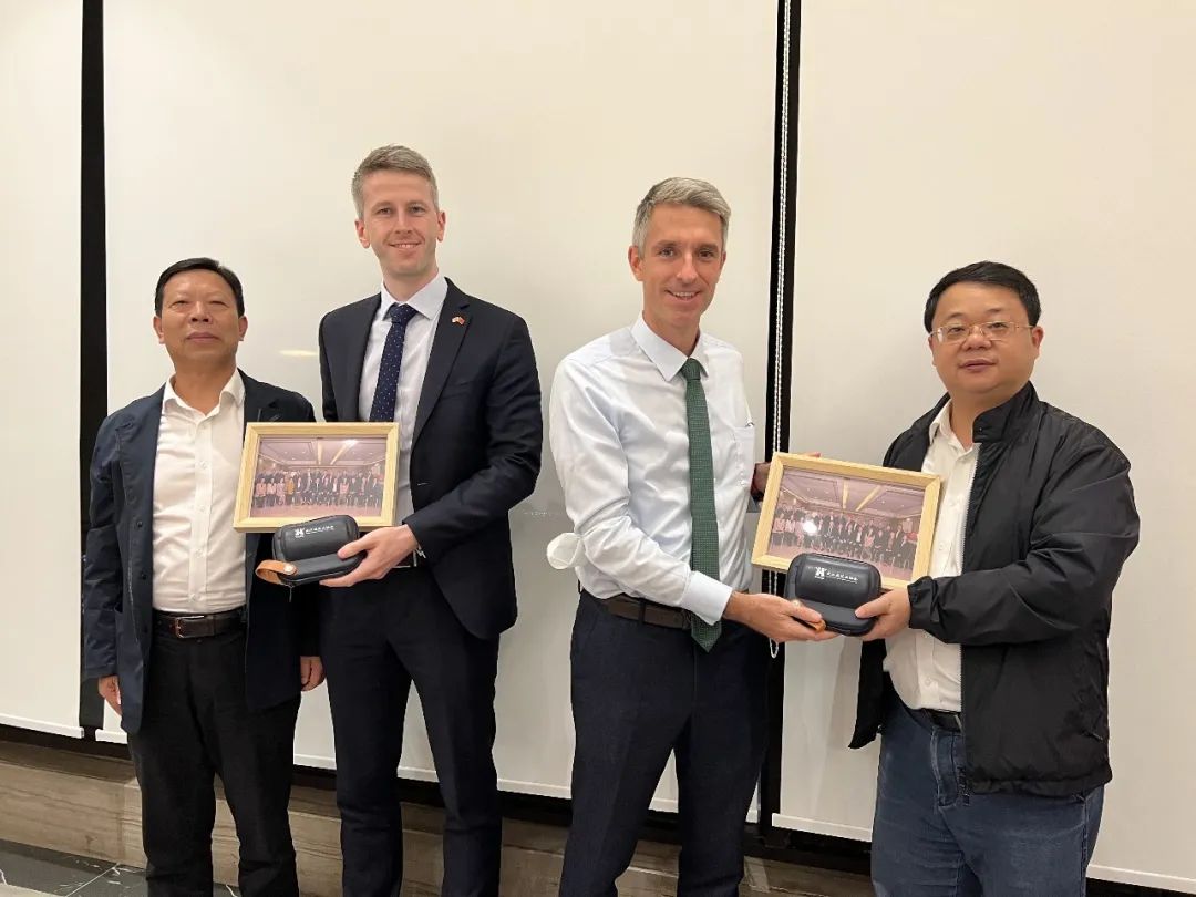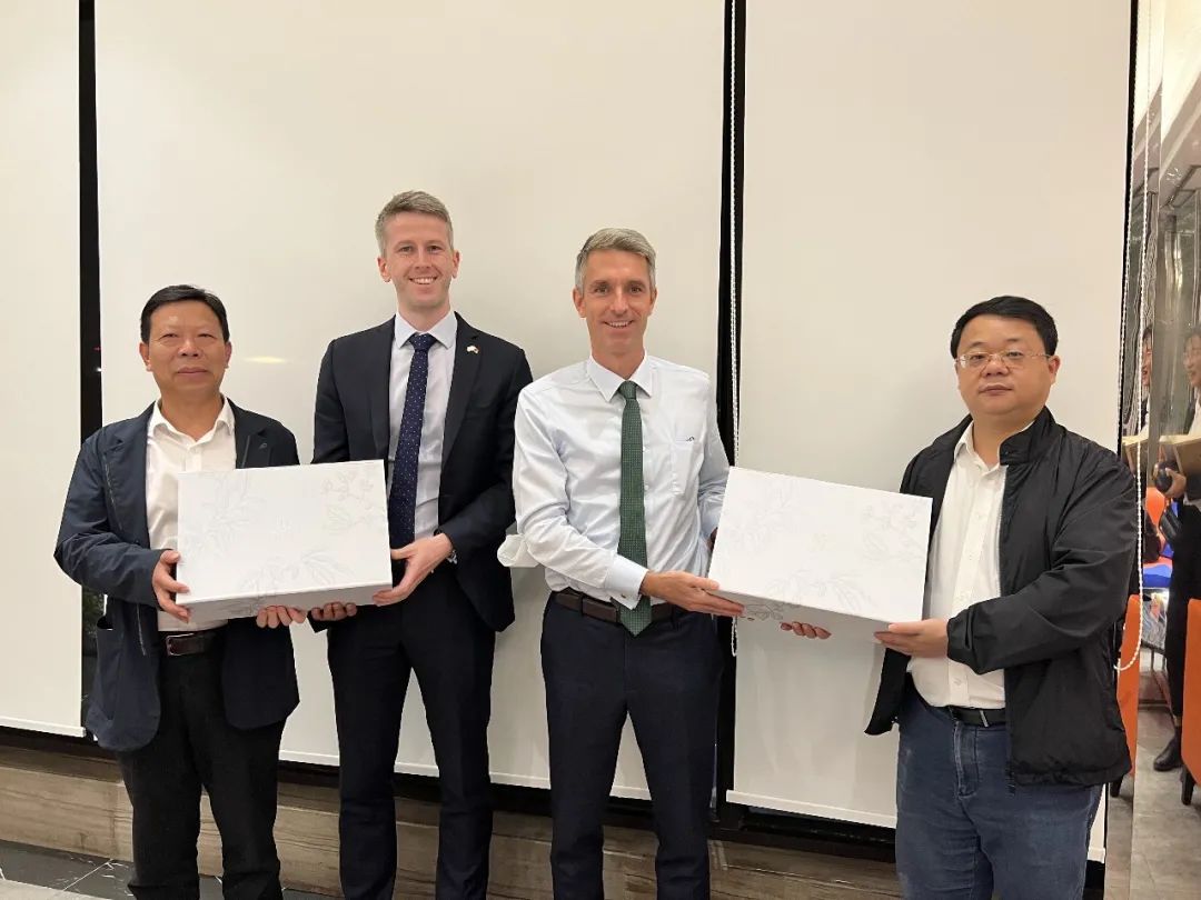 会后,协会副会长刘庆、秘书长李红青与英国驻华贸易部副使节杜涛、英国驻武汉总领事馆贸易投资领事海天佑互赠礼物,与会嘉宾集体合影留念。