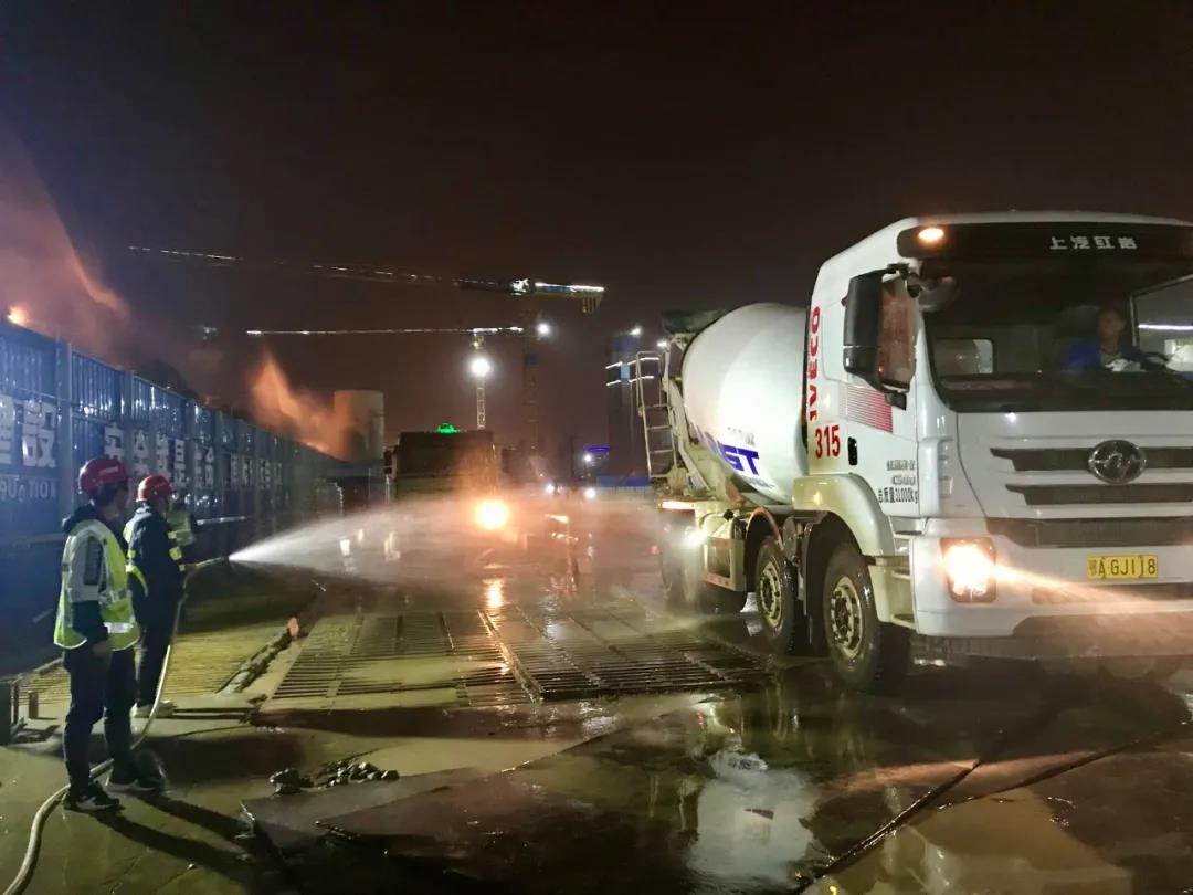 2日22时许,记者来到汉阳四新大道中南科研设计中心项目工地。现场看到,项目正进行基坑和地上结构混凝土浇筑施工,围挡上的喷淋系统正在喷淋降尘;渣土车和混凝土搅拌车经过洗车槽、冲洗机和人工保洁的“三级冲洗”,方可驶出工地。