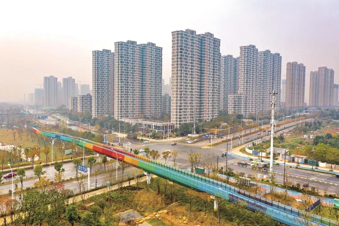 连日来,有市民驱车行驶在武汉东湖高新区高新二路时会注意到,这里增加了一座色彩斑斓的人行天桥,如彩虹般卧在道路上空,和一旁的绿道相得益彰。