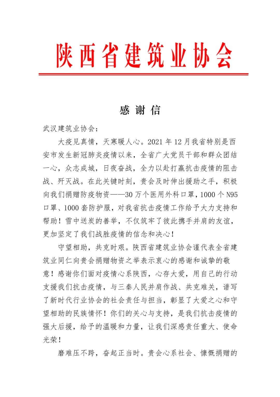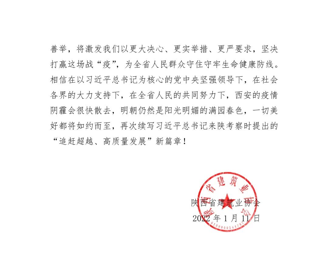 1月11日 陕西省建筑业协会 向我会发来一封真挚的感谢信 感谢我会驰援西安抗疫 捐赠防疫物资 与陕西人民并肩作战 共克难关 疫情无情,人间有爱 一方有难,八方支援 让我们共待花开疫散 一切美好都将如约而至