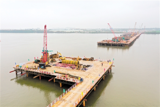 昨日(3月29日),由中铁十一局承建的广东江门银洲湖高速公路重点控制性工程潭江特大桥北岸主墩桩基开钻。银洲湖高速公路全长53公里,连接江(门)肇(庆)高速公路与西部沿海高速公路。 (文/图 新华社)