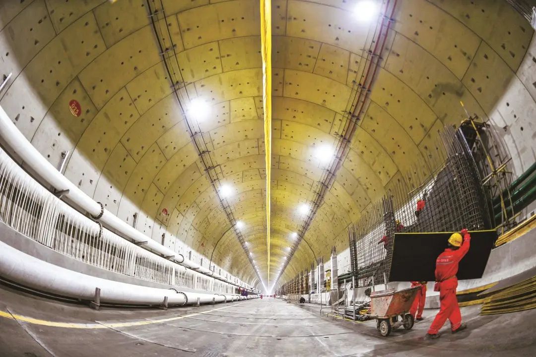 进入地下作业区,在已完成管片铺设的区域,建设者们正在开展同步施工,施工人员在右侧的壁面处安装钢筋支架,为铺设二层车道板做准备。