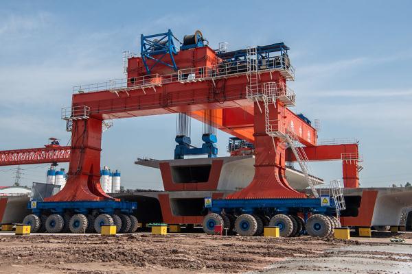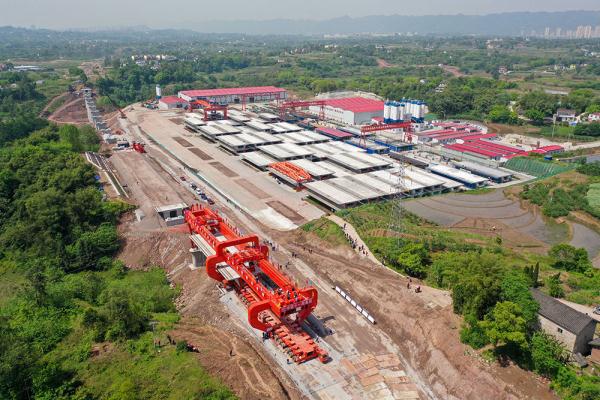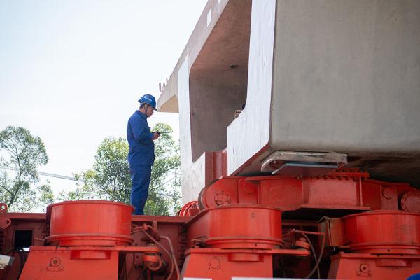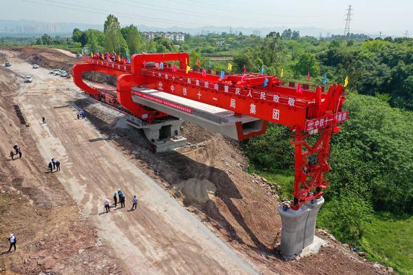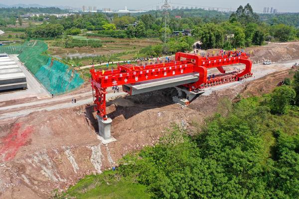 4月8日,在渝昆高铁重庆段建设现场,工程设备在搬运箱梁。新华社记者 唐奕 摄