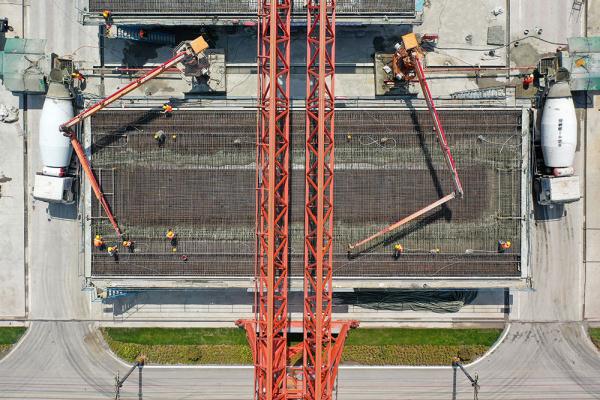 4月8日,在渝昆高铁重庆段建设现场,施工人员对箱梁进行混凝土浇筑(无人机照片)。新华社记者 唐奕 摄