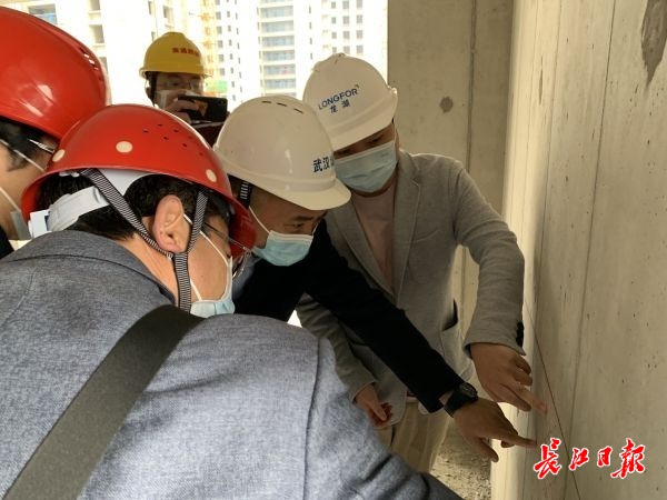 执法检查人员首先来到位于武昌区和平大道与团结路交会处的武汉龙湖武昌滨江天街项目一期总承包工程,查看了施工场地、材料堆放、消防配电设施等,还随机抽检6栋20层。检查人员在20层发现部分高层窗户临边防护设置不合乎标准,有的临边防护高度不够,存在安全隐患。执法人员指出:“高坠是工地危险之一,一定要重视,完善所有高层临边防护,严格标准化施工。”