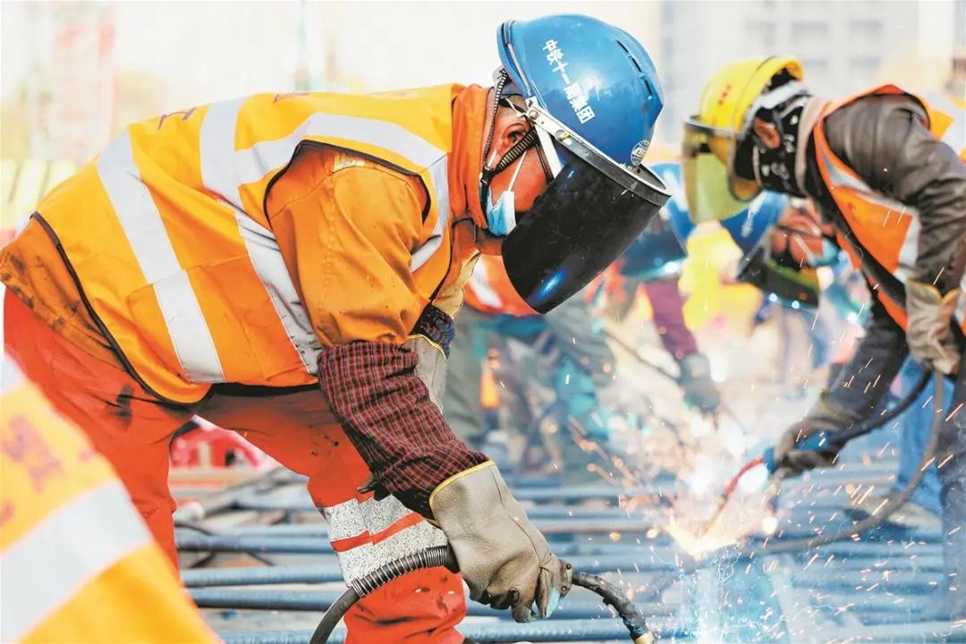 焊花飞舞,机器轰鸣。5月1日,在武汉轨道交通12号线中一路站建设工地上,中铁十一局256名工友、41名管理人员全力奋战,冲刺下一个施工节点。