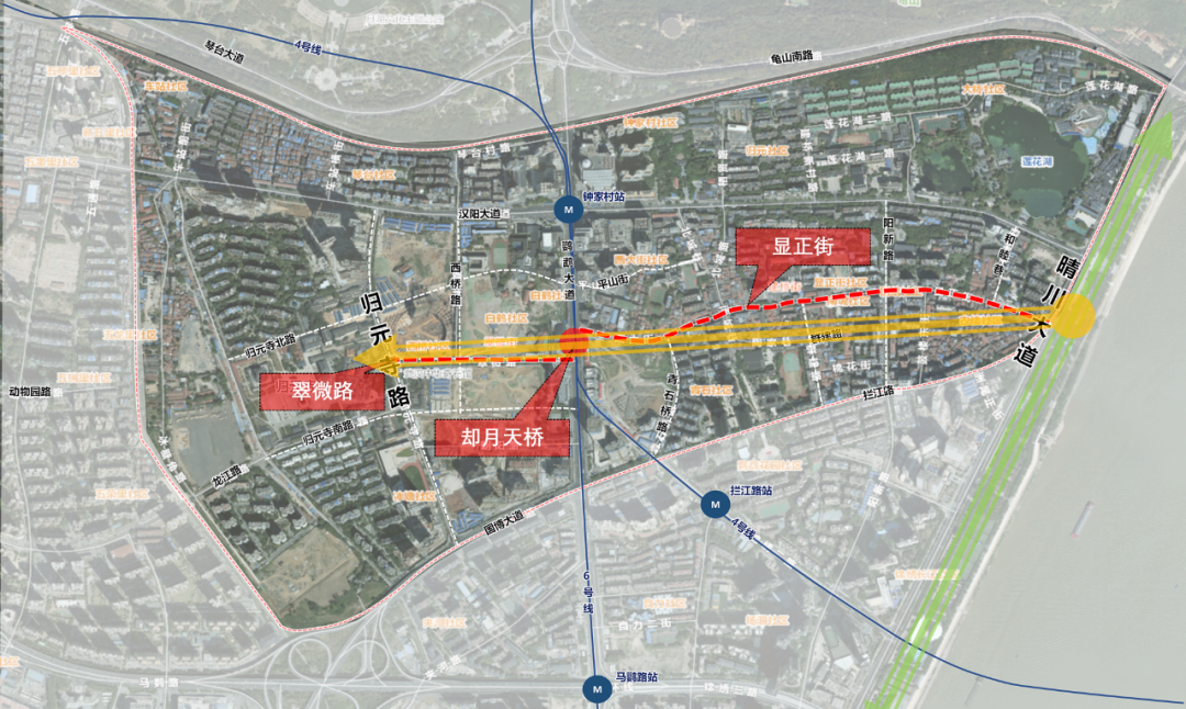 这条西起归元寺路、东至晴川大道的古今交融文化商业中心轴,整体打造翠微路、却月天桥、显正街,将增设翠微路步行街、却月天桥、凤山门广场、汉阳树公园、钟鼓楼广场,以及连接汉阳滨江公园的城市甲板六大景观节点。