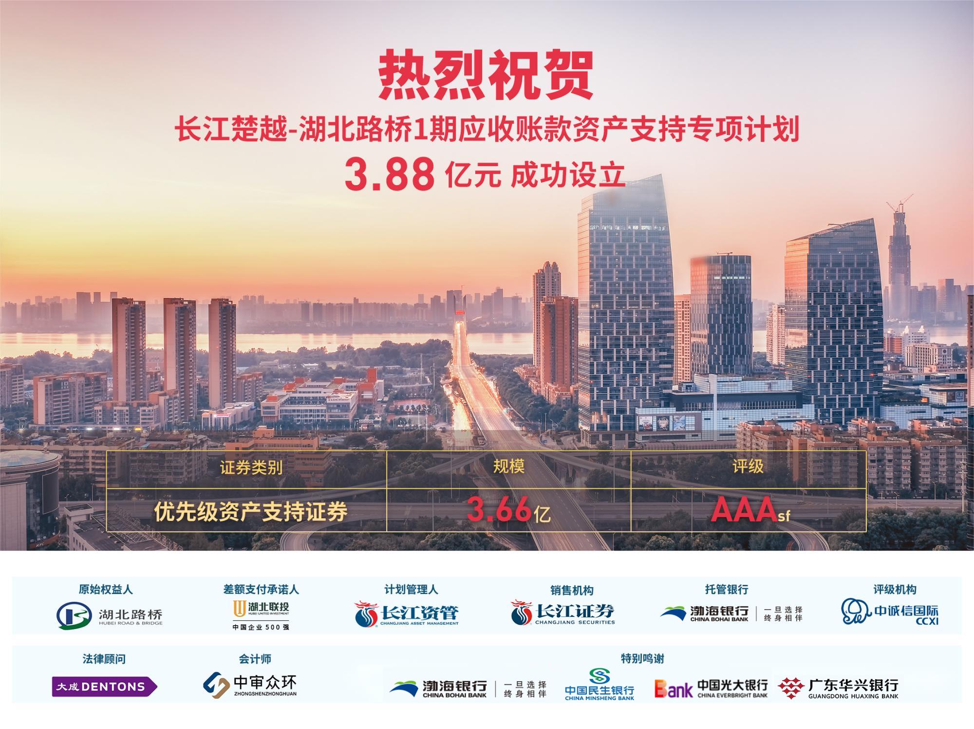 12月28日,湖北路桥在上海证券交易所成功簿记发行“长江楚越-湖北路桥1期应收账款资产支持专项计划”产品(以下简称“ABS”)。本项目储架总额度不超过10亿元,首期募集资金3.88亿元,债项评级AAA,为湖北联投体系内首单出表型应收账款ABS项目。