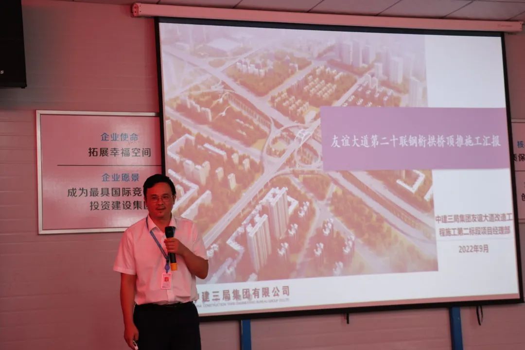 中建三局基建投公司武汉分公司总工程师李琦介绍了该项目钢桁架拱桥施工的总体部署,并就临时支架结构设计、基础处理、钢桁架拱吊装工艺、顶推滑移施工工艺4个方面进行了讲解。