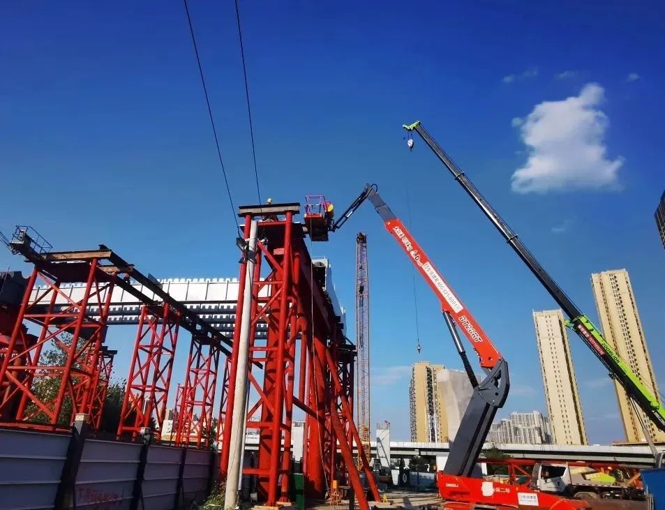 此工艺施工难度大,质量、安全管控十分严格。在场外将钢桁拱拼装完成后,采用“顶推+滑移”施工方式,将钢桁拱(85米)+导梁(60米)顶推到位,观摩亮点众多。