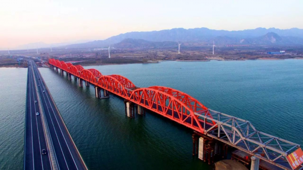 由中铁大桥局承建的官厅水库特大桥是京张高速铁路的重点工程之一。全长9.08千米,主桥采用8孔110米简支拱形钢桁梁,是时速350千米无砟轨道高速铁路钢桁梁桥。大桥的设计体现了“轻质、大跨、环保”的现代铁路建设理念。