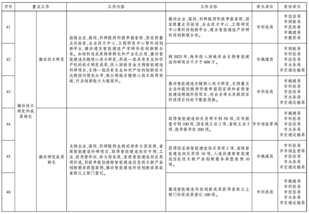 (六)推动技术研发和成果转化。鼓励企业、高校、科研院所积极申报国家级和省级重点实验室、企业技术中心、工程研究中心等科技创新平台,推动建立智能建造产学研科技创新联合体。加快科技成果转移转化和产业化应用,推动智能建造关键核心技术研发,形成一批具有自主知识产权的技术研发成果,投入财政资金支持智能建造科研项目,支持一批具有自主知识产权的创新技术达到国内领先水平,部分领域关键核心技术取得突破,行业创新能力大幅提升。支持企业、高校、科研院所主持或者参与国家级、省级智能建造科研项目,取得智能建造相关专利、工法、软件著作权,参与国家级、省级智能建造相关奖项评选,积极申报住建部智能建造信息技术新产品创新服务典型案例,推动智能建造科技创新成果在省级以上部门登记。(责任单位:市科技局、市财政局、市发改委、市教育局、市经信局、市城建局、市市场监管局、市交通运输局、市水务局)