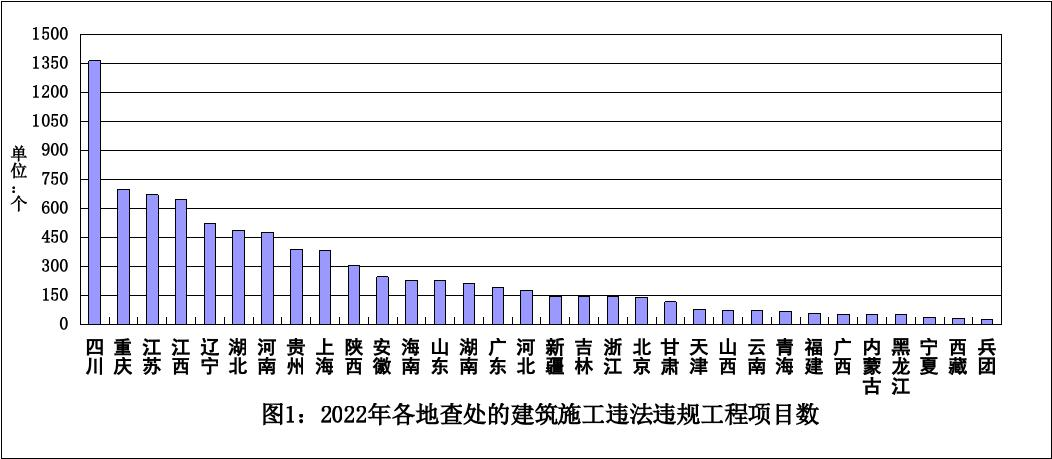 从查处的违法违规工程项目总数看,四川、重庆、江苏、江西、辽宁5省(市)查处项目数量较多,分别查处1365个、697个、671个、645个、525个(详见图1)。