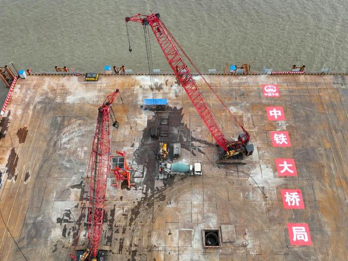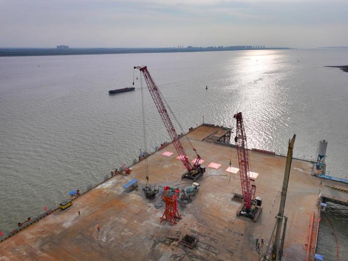 这是6月29日拍摄的崇启公铁长江大桥4号主墩施工现场。