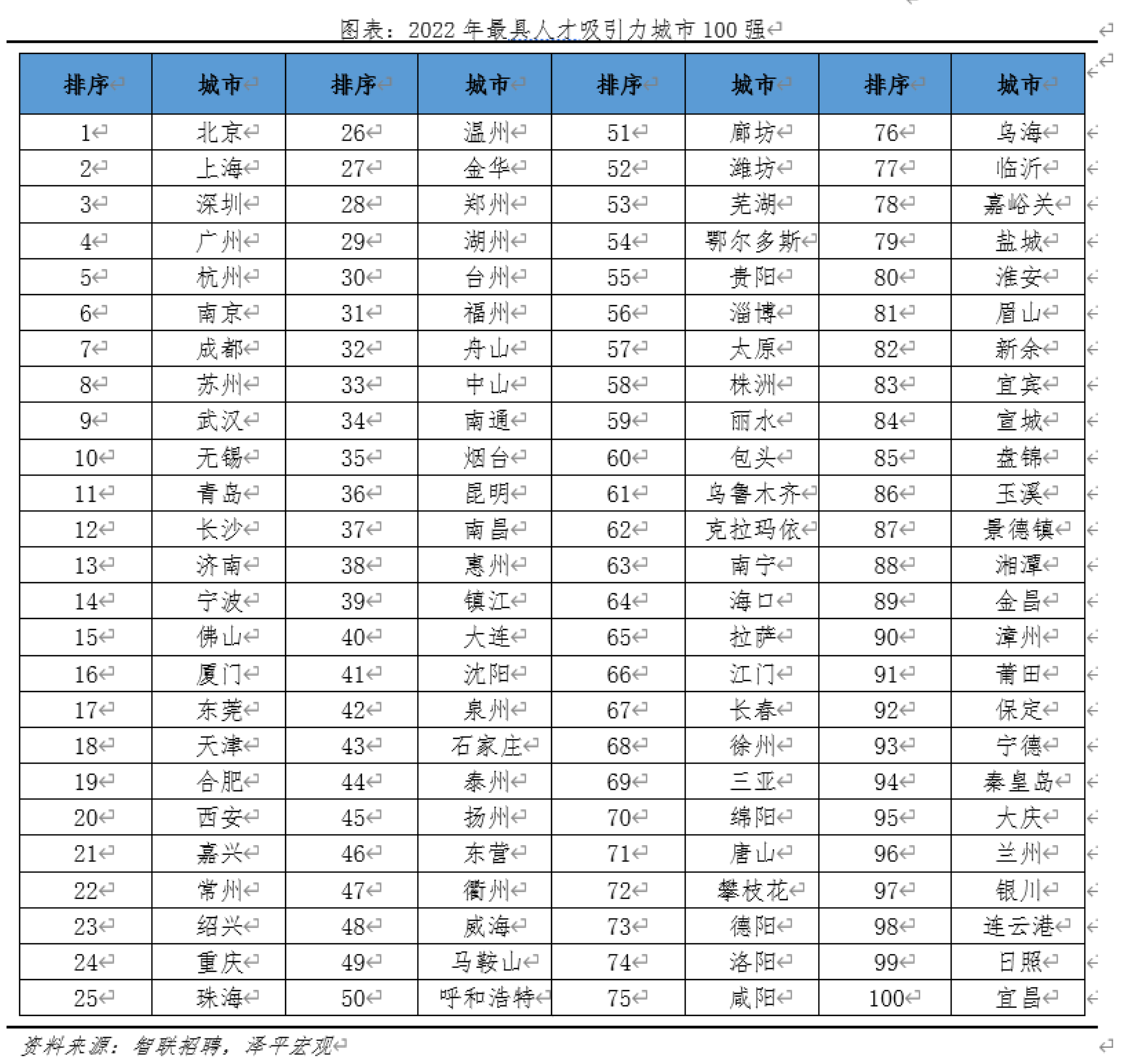 据智联招聘发布的《中国城市人才吸引力排名:2023》数据显示:在“中国最具人才吸引力城市top100”排行榜中,东部城市占比超七成。北京、上海、深圳位居前三,广州、杭州、南京、成都、苏州、武汉、无锡位居前十。