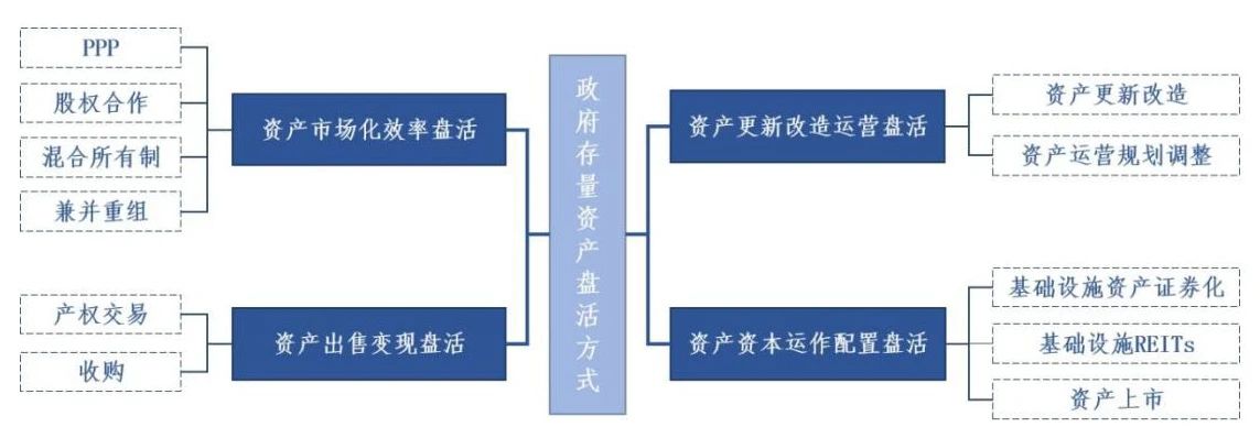 存量资产盘活偿还是指采取各种方式来整合资产并且利用好现有的资产,实现国有资产保值增值,利用回收资金偿还政府隐性债务。基于国家政策文件,以及实践经验,政府存量资产盘活方式总结为以下四大方式: