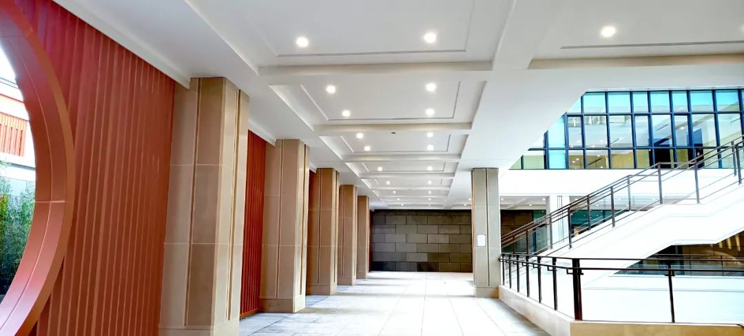 从顶楼屋角的阳台向外看去,160地块项目的布局呈C型三合院,由三个方向的四栋主体建筑组成。建筑幕墙素雅大气,窗户上装饰着中式风格的花格窗,在楼宇边缘楼梯间的外侧是由仿木花纹格栅构成的“缎带”,从建筑外观来看,栅格间的空隙不会让人觉得沉闷,赋予建筑活力的同时也更便于自然通风。