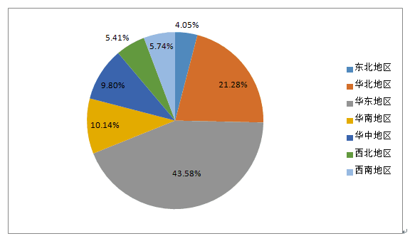抽样企业中,华东地区(上海、江苏、江西、浙江、福建、山东、安徽)企业数量占比43.58%;华北地区(北京、天津、河北、内蒙古、山西)企业数量占比21.28%;华中地区(湖北、河南、湖南)数量企业占比9.80%;华南地区(广西、广东)企业数量占比10.14%;西南地区(云南、四川、贵州、重庆)数量企业占比5.74%;西北地区(陕西、青海、宁夏、新疆)企业数量占比5.41%;东北地区(辽宁、黑龙江)企业数量占比4.05%。